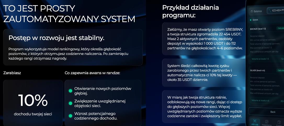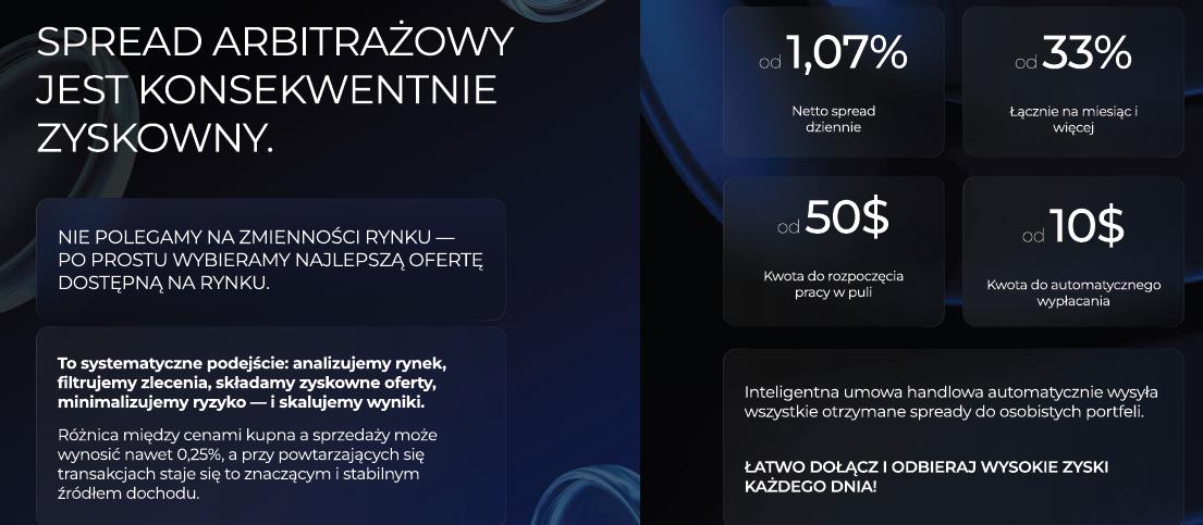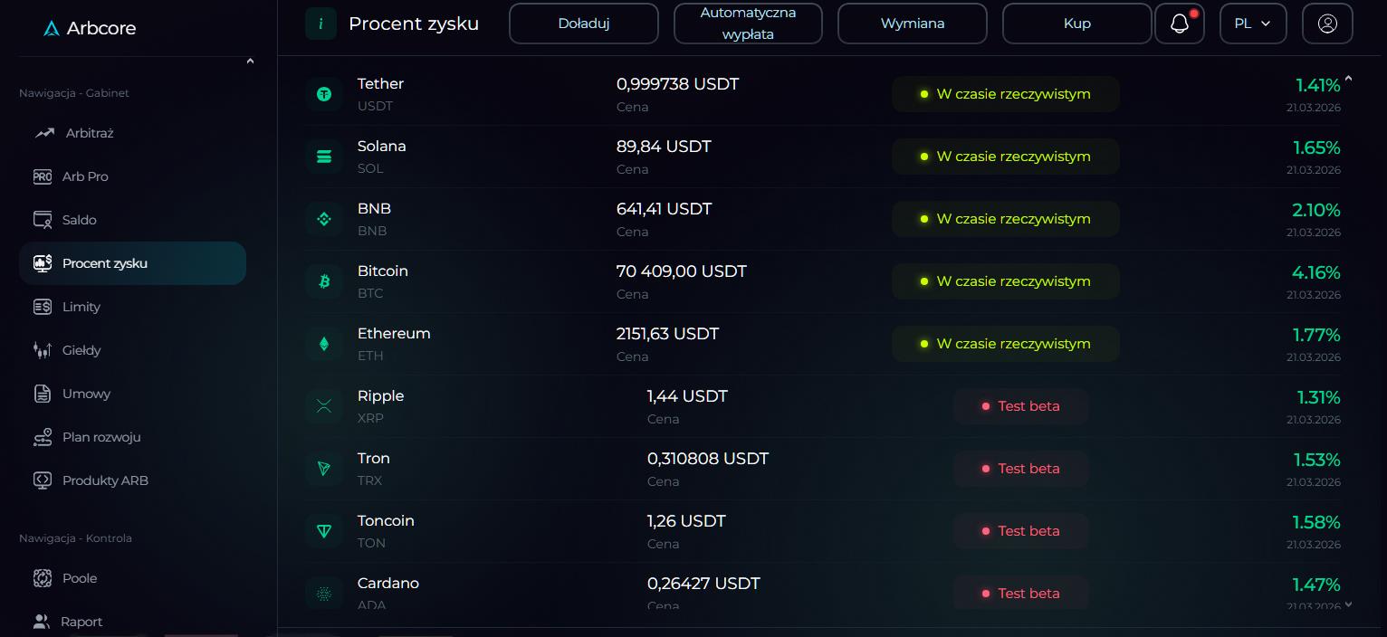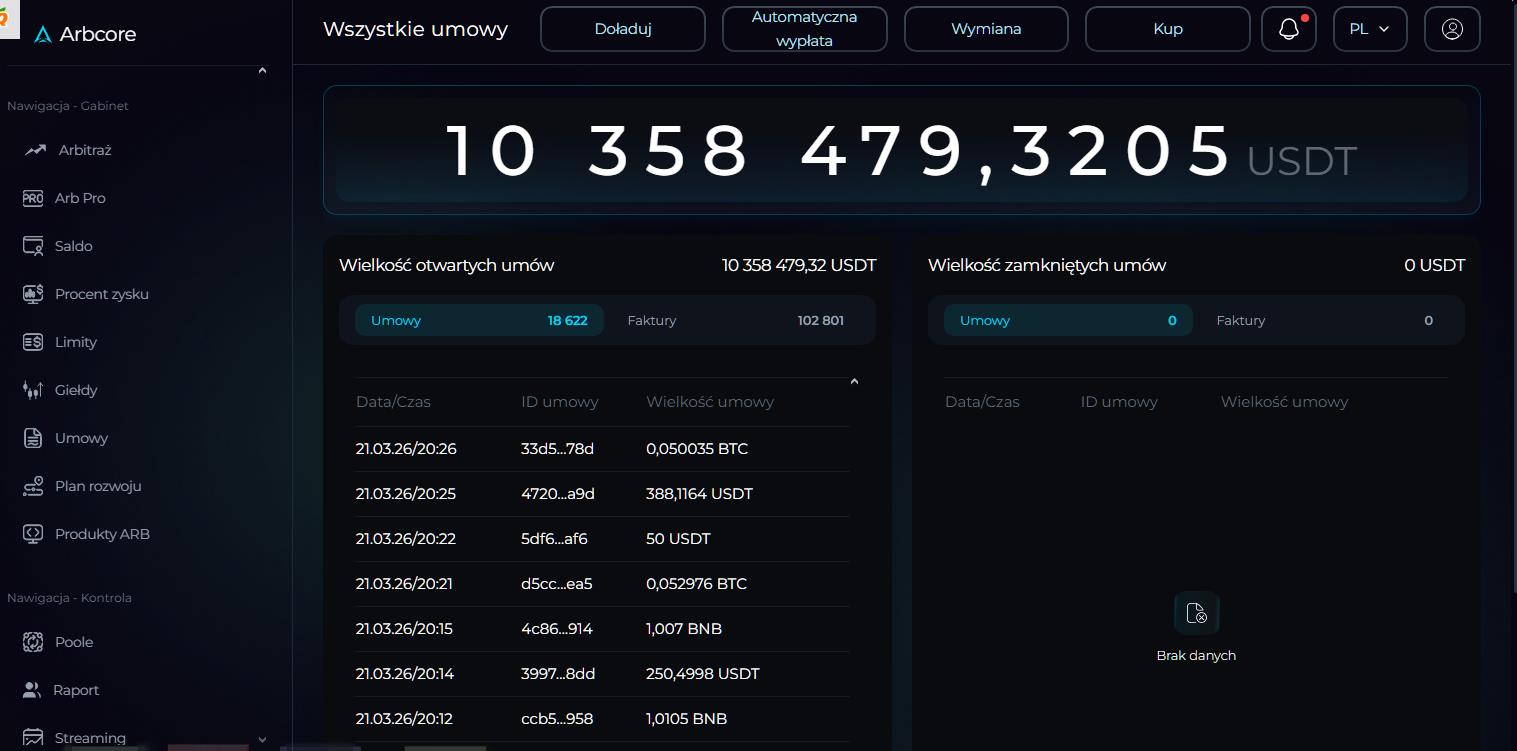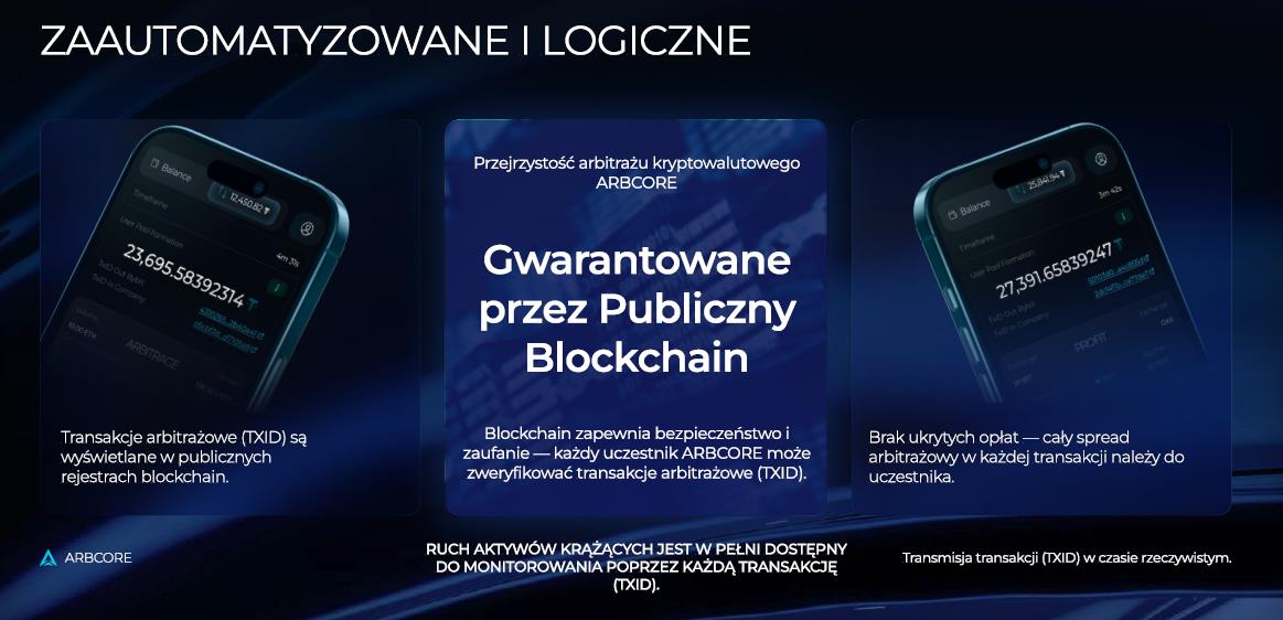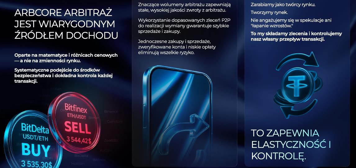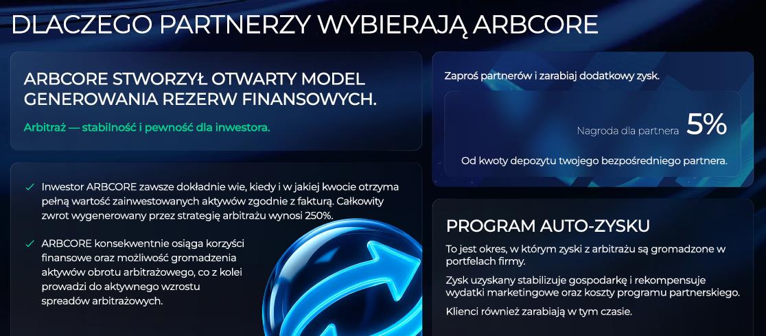 Firma została założona w 2025 roku, a w styczniu 2026 roku miała swój Pre Launch. Zbudowała silny i zróżnicowany zespół z pracowników wiodących firm zarządzania aktywami i absolwentów prestiżowych uczelni, z doświadczeniem w różnych dziedzinach. Projekt ARBCORE ma strukturę cross-chain i uproszczoną technologię arbitrażu, z technologicznym rdzeniem i regulowanym kontem wpłat, a pełna automatyczna decentralizacja jest zapewniona przez smart kontrakty handlowe. Transakcje arbitrażowe , zachodzą na około ...430 giełdach! Publiczny arbitraż krypto Ethereum, Bitcoin, Solana, BNB, USDT i innych aktywów to prosta strategia zarabiania na różnicach cen między giełdami. Wykonują natychmiastowe i jednoczesne wymiany arbitrażowe na dwóch giełdach krypto. W operacji arbitrażowej aktywa są wysyłane na giełdy, szybko realizowane zleceniami przeciwstawnymi i wracają z zyskiem ze spreadu.