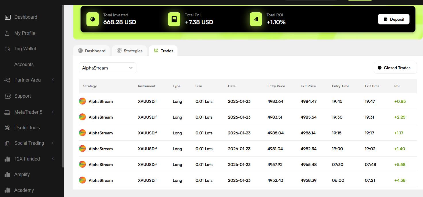 W Tag Markets, obok strategii Sonic mamy także wiele innych strategii do uruchomienia. Poniżej widać efekty z Sonic oraz AlphaStream
